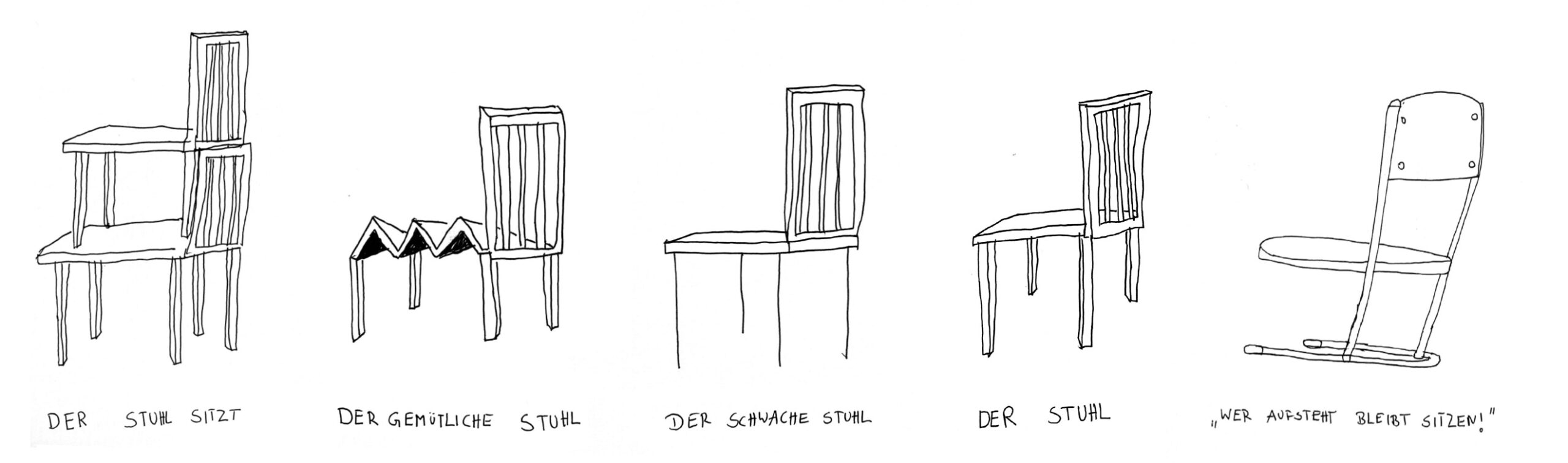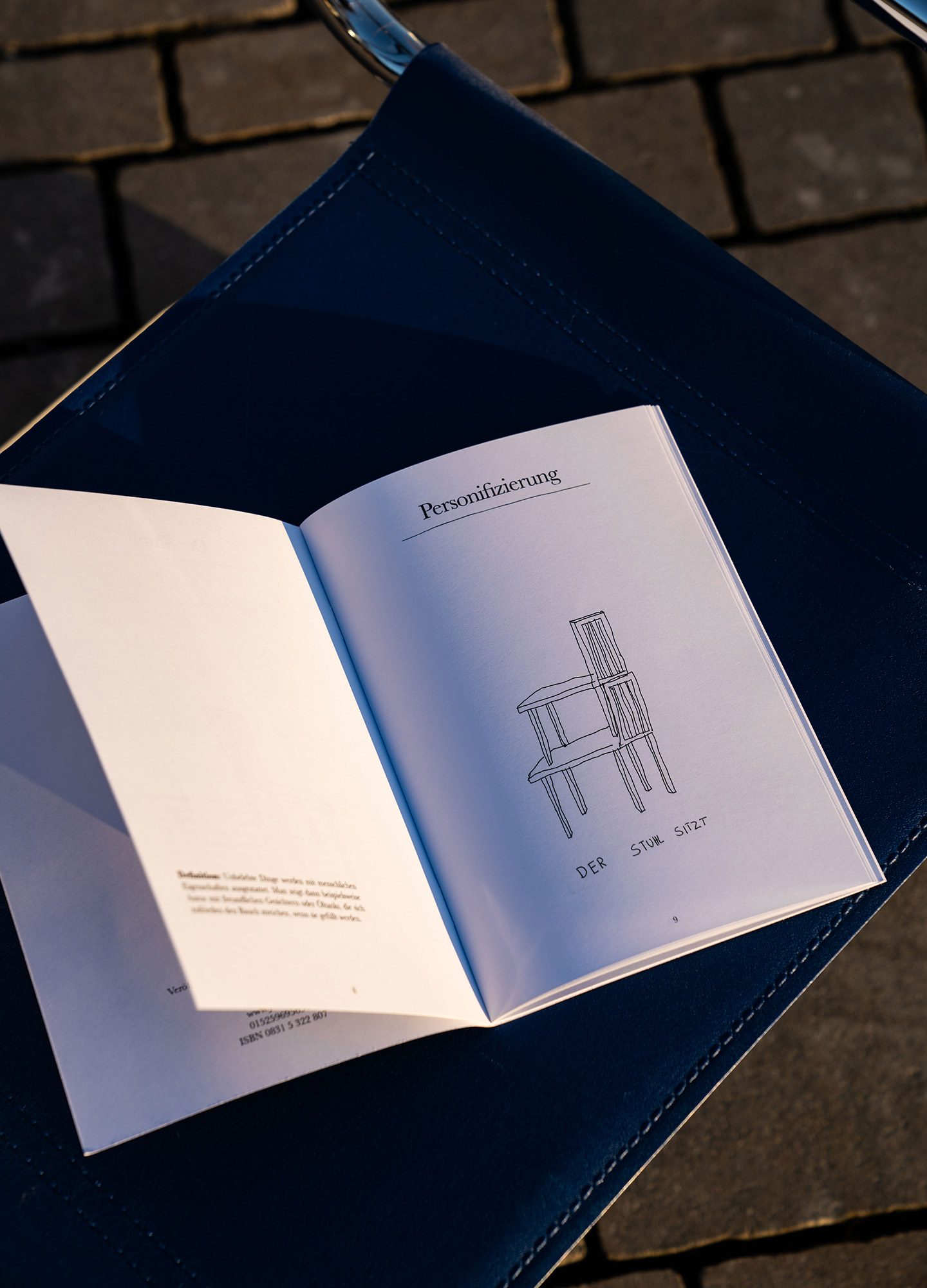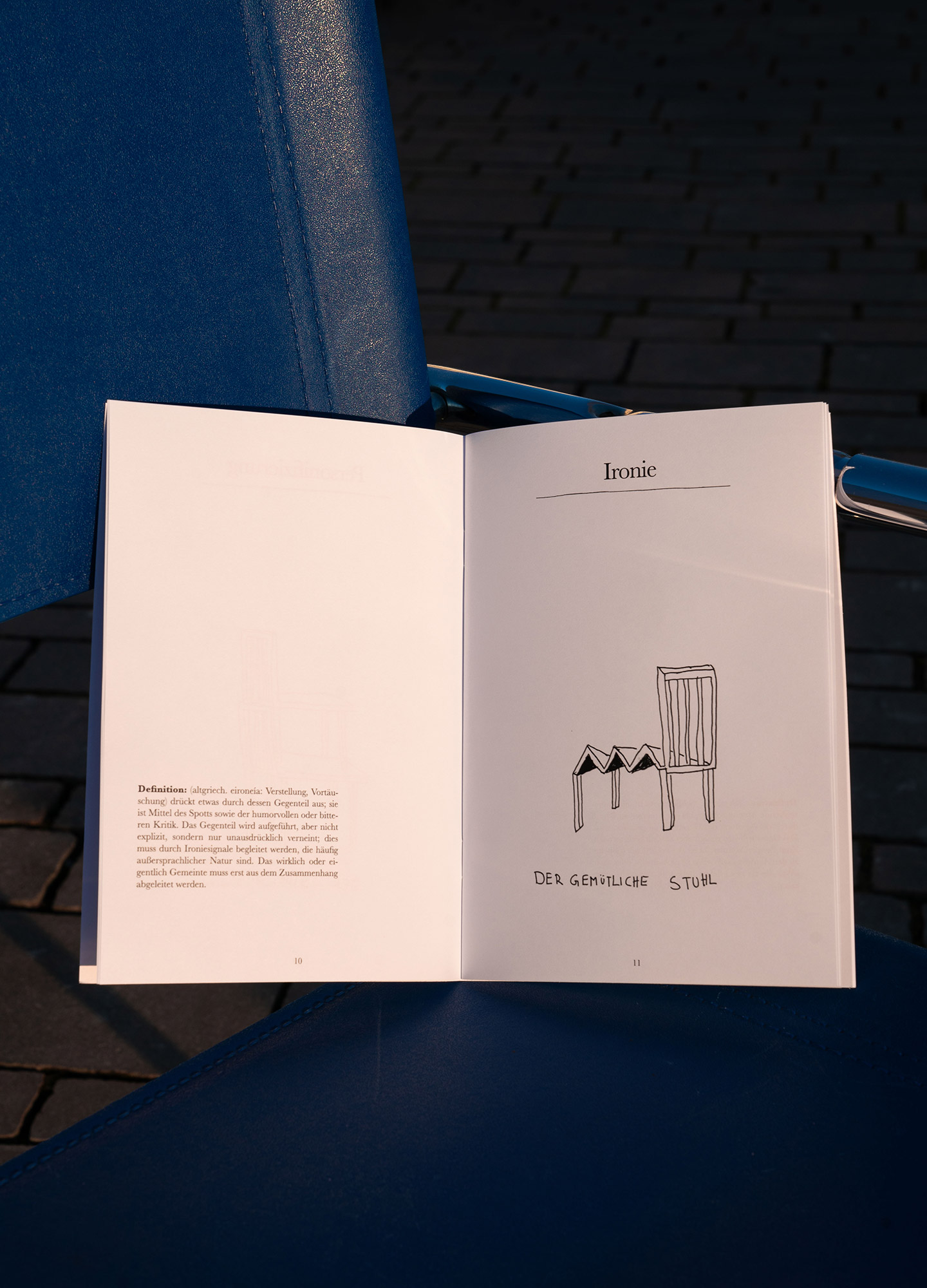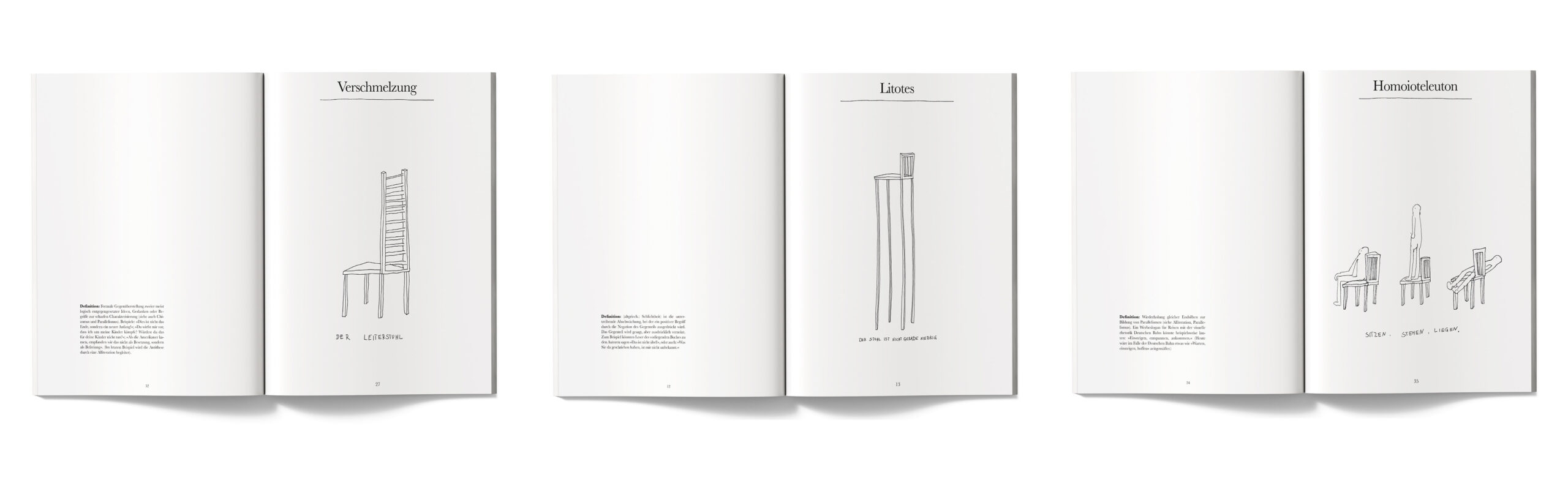 The book brings together 40 pages. Each page combines a clear definition of a rhetorical figure with a black-and-white chair illustration. A chair that sits on another chair becomes personification. A spiky, uncomfortable chair labeled “the comfortable chair” becomes irony. Other chairs twist, duplicate or contradict themselves, always reflecting how language can be bent into unexpected forms.